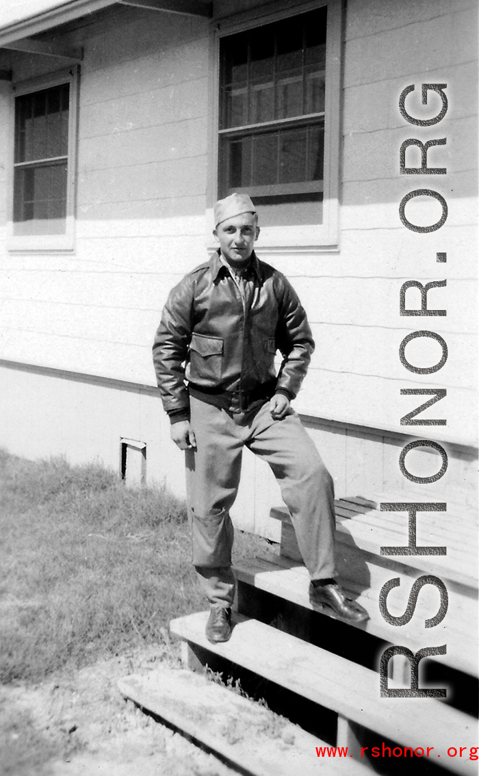 James C. Vurgaropulos who died during a mission in 1944 in China, in front of an barracks building at a US base stateside before being sent to the CBI.